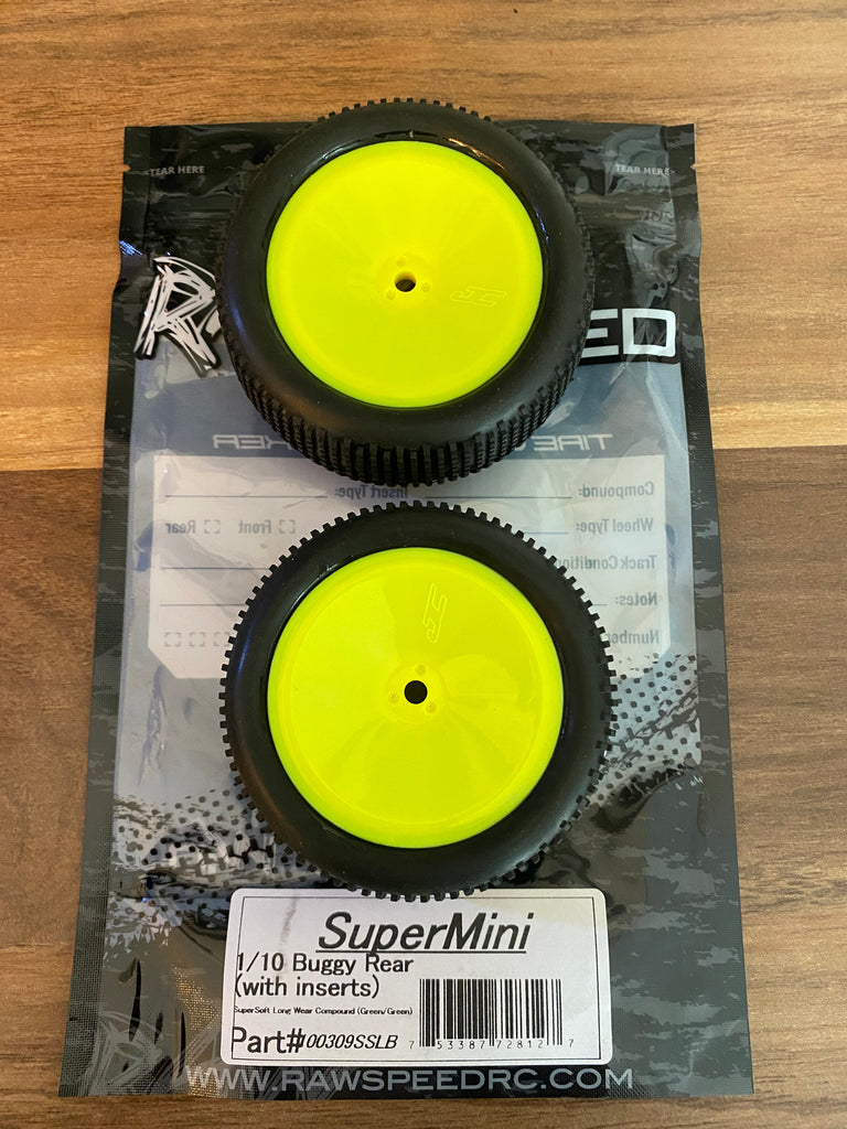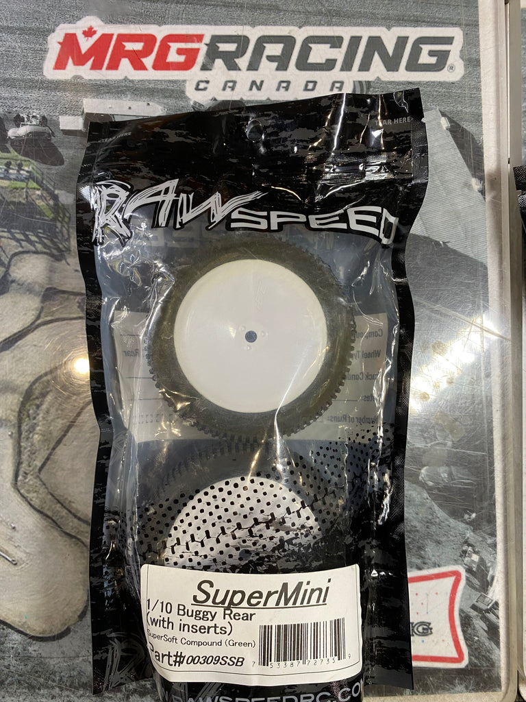 Raw Speed Super Mini 1/10 Buggy Rear Tires fit industry standard 2.2 inch buggy wheels and include closed cell inserts.
