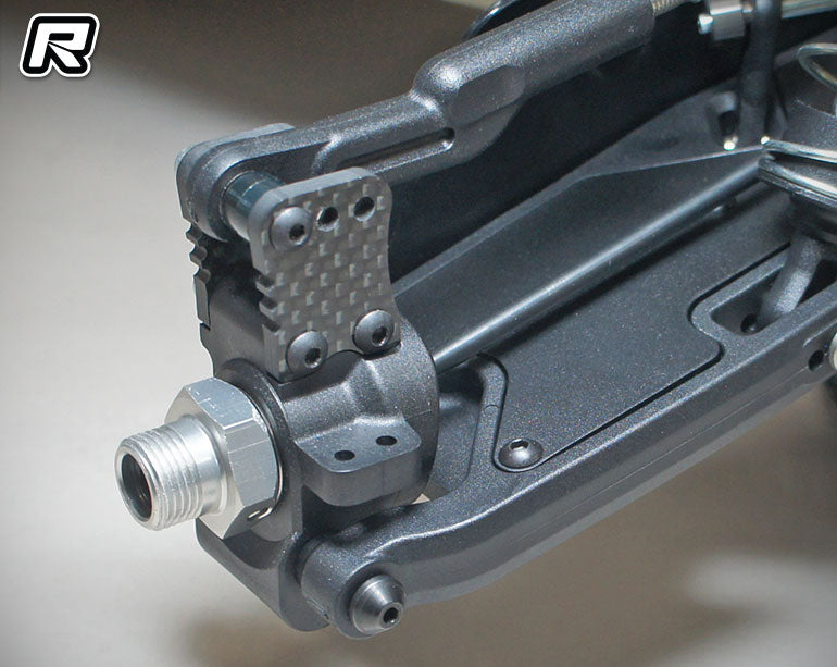The “C” and “D” suspension mounts use square pills for increased tuning of toe-in, anti-squat, and geometry. The front and rear arms use an impact resistant material for increased durability. The molded uprights have carbon fiber plates to adjust the rear roll center.