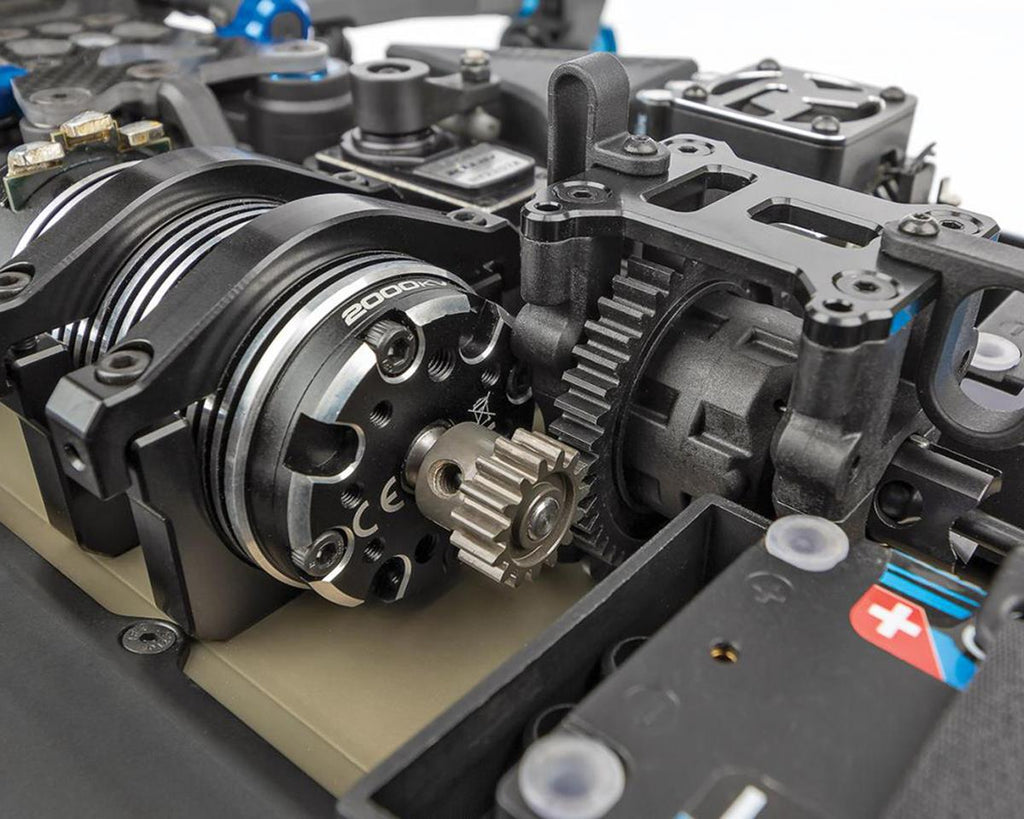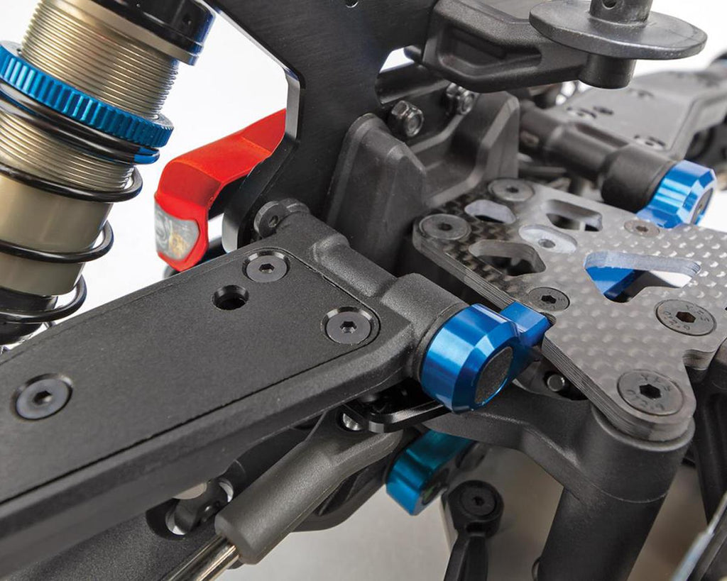The Revised rear chassis brace enhances durability and offers multiple flex tuning options for optimized performance. Centrally mounted to the gearbox, it reduces material fatigue, centralizes shear forces, and improves drivetrain longevity. Three mounting configurations allow for different levels of chassis flex: maximum rigidity with both screws, moderate flex with one screw in the long location, and maximum flex with one screw in the short location. Additionally, the upper brace joint provides two tuning options—using molded inserts to limit twisting or an optional turnbuckle ball for multi-directional flex. A removable insert further fine-tunes flexibility, giving racers the ability to adjust chassis response to suit various track conditions.