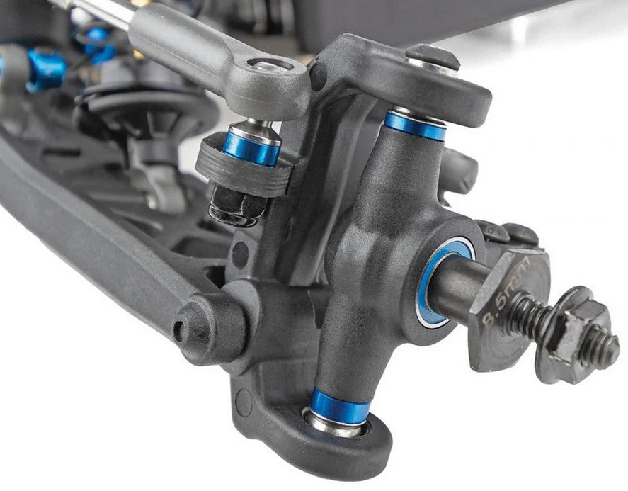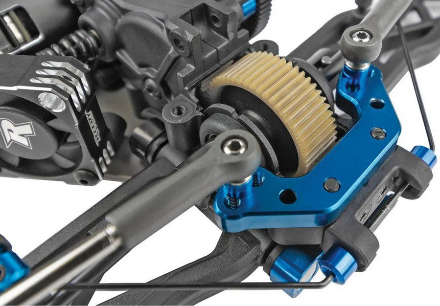 Durability is at the forefront with the RC10T7’s reinforced front end. It includes an aluminum front bulkhead, steel hinge pin brace, updated B7 V2 caster block, and zero KPI steering blocks with adjustable trail. These enhancements not only increase stiffness and strength but also provide racers with fine-tuned steering feel and precise control. The vertical front outer ball stud further expands tuning possibilities by allowing adjustments to roll center, camber gain, and link length.
