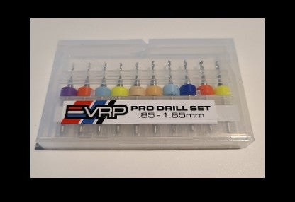 This is a VRP Pro Metric Shock Piston Drill Set, featuring drill bits between .85-1.85mm in increments of 0.05mm. We have these sets special made to have the correct range of the most common drill sizes used in rc pistons. The set comes with a drill bit holder box that has a color-coordinated label so you can quickly figure out the drill bit sizes to keep them in order.