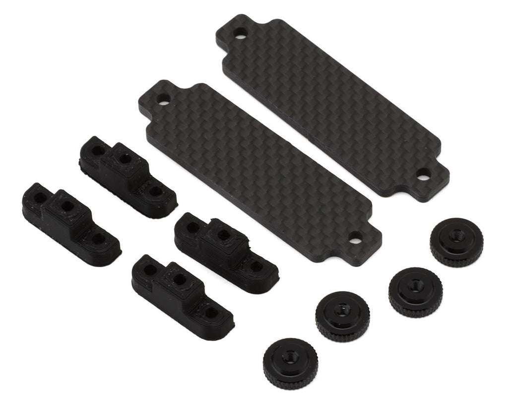 Upgrade your Sparko F8E buggy with this premium carbon fiber battery strap, designed for strength, security, and simplicity. Its lightweight, high-quality construction eliminates the need for dual fabric or plastic straps, replacing them with a sleek carbon design that mounts securely using thumbscrews. This not only reduces weight but makes battery changes quicker and easier—perfect for racers who demand performance and convenience.