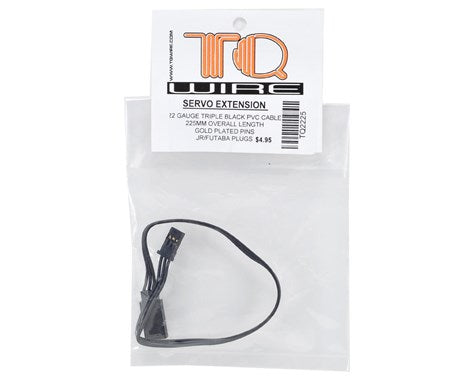 This is a 225mm TQ Wire Triple Black JR/Futaba Servo Extension. Made with heavy duty 22 gauge conductor, gold plated hardware and triple black insulation, these leads can handle the hungriest servos but remain very flexible. 225mm length, with JR/Futaba compatible ends.