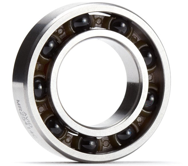 The Avid 14x25.4x6 Ceramic Engine Bearing has offset balls which offers the maximum performance and reliability to your racing engine. The bearing specs are Abec3, 9 G3 Si3N4 Ceramic Balls, PA66 with 30 Glass Fiber Cage, Deep Groove Offset Races, and Chrome Steel 52100 Rings. It has no seals to allow for proper lubrication from the oil in your fuel. A ceramic engine bearing can allow most RC engines to spin an extra 500 rpm with less drag and the life of the bearing is far greater than a steel bearing. Another benefit to ceramics is the weight difference in the balls allowing for less rotating mass.