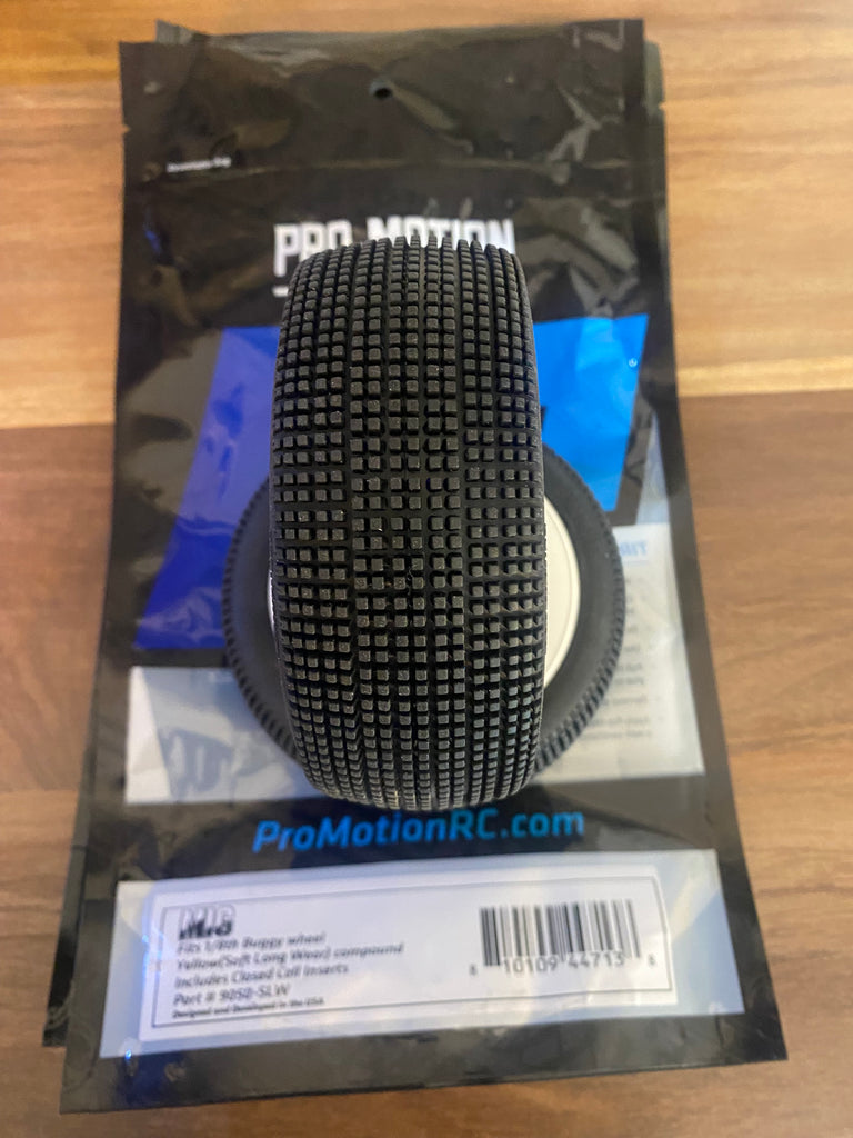 Pro-Motion MIG 1/8 Off-Road Buggy Tires with Foam Inserts. These tires are designed specifically for long main events and high abrasion, high wear situations. The tightly placed pins are paired in groups of four with the pin size increasing towards the center. These nimble tires are great at dealing with almost any condition.